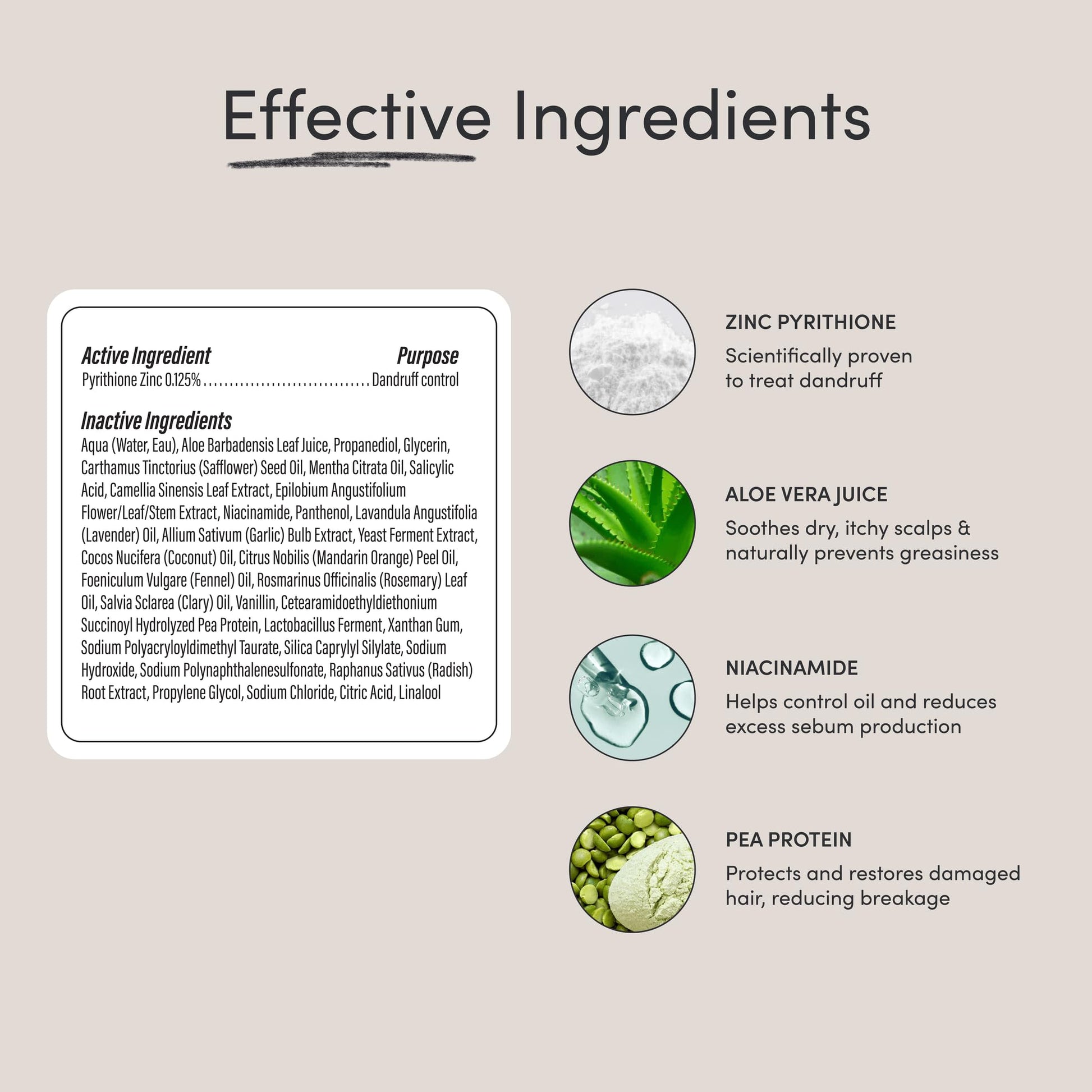 - Formulated with vegan, cruelty-free, innovative, and clean ingredients including Zinc Pyrithione (dermatologist-tested and FDA-listed active ingredient designed to treat dandruff), Salicylic Acid (helps gently exfoliate the scalp), Aloe Vera (soothes and moisturizes scalp) and Green Tea (helps revitalize the scalp).